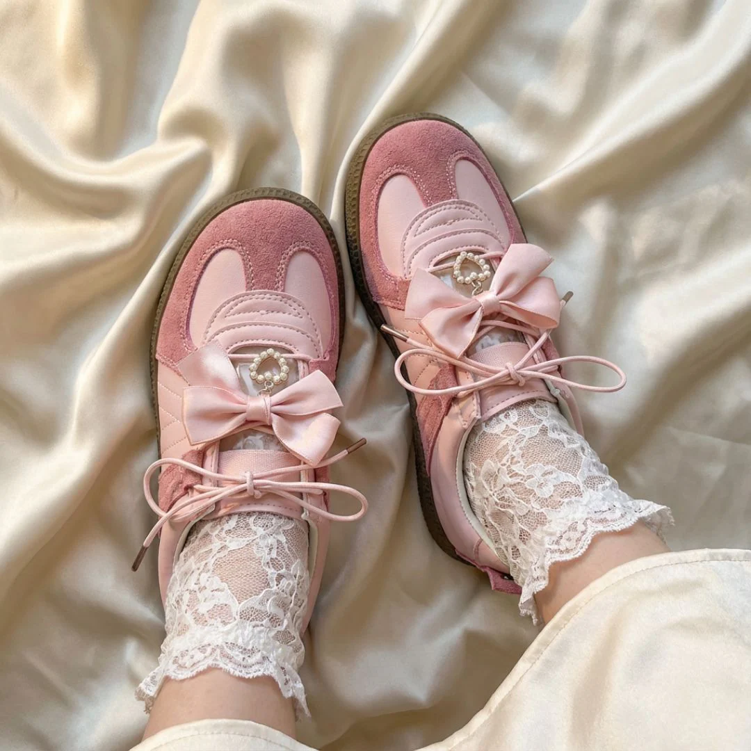 - Your daily dose of romance, now in a sheer ballet sneaker. Meet the Balletcore Pretty Pink Bow Heart Sneakers, a romantic Valentine’s Day inspired style designed with delicate lace, satin bows, and pink heart charms. Featuring a subtle see-through lace upper paired with a heart charms, this pair blends balletcore aesthetics with everyday sneaker comfort.